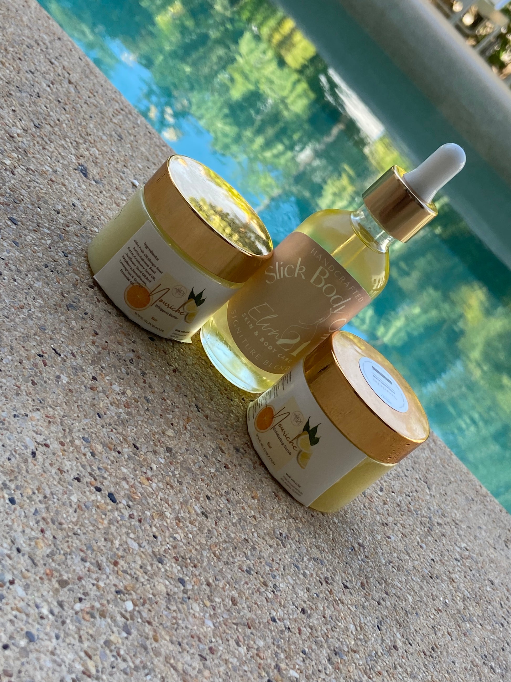 Enjoy Exfoliating Scrub,Whipped Butta’, and Slick Body Oil all in 2oz containers. Perfect to travel with. Keeping your skin free of build up and dry skin.